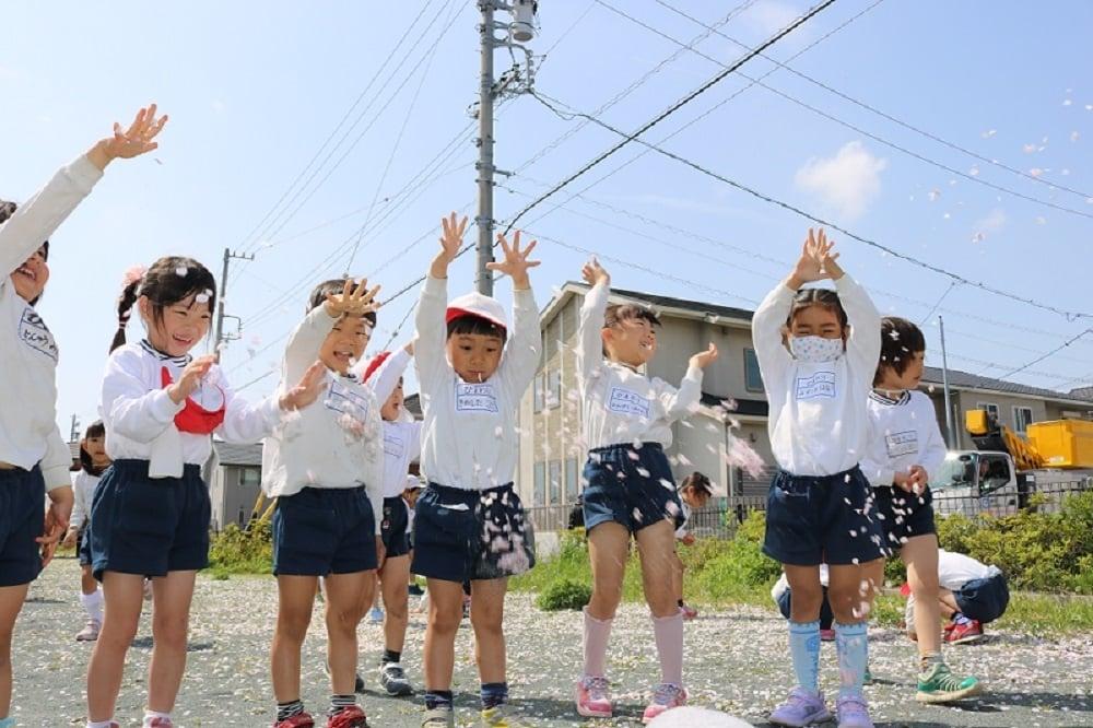 「せんせい、みてー」と桜の花びらを沢山手のひらにのせ、投げて桜吹雪に!それを見ていた子どもたちも一緒に「せーの!」で投げ、風に吹かれて飛んでいく花びらを見て大笑い。とても楽しんでいました。