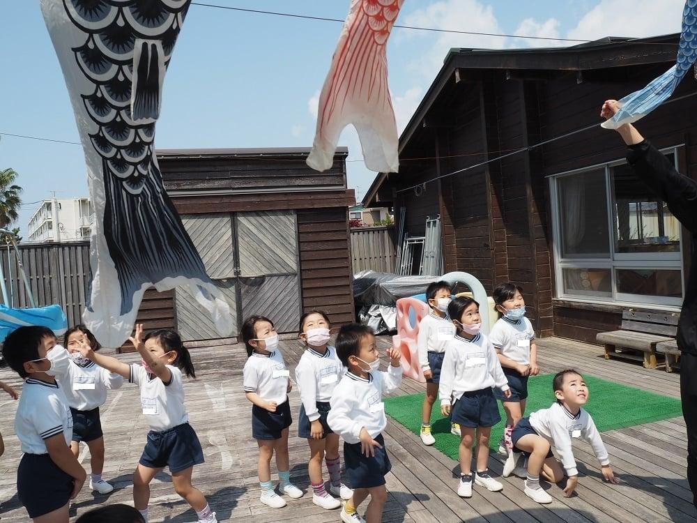 5月は天気が良い日が多く、こいのぼりが泳いでいる園庭で沢山遊びました。こいのぼりの色や大きさの違いが気になっていた子ども達でした。