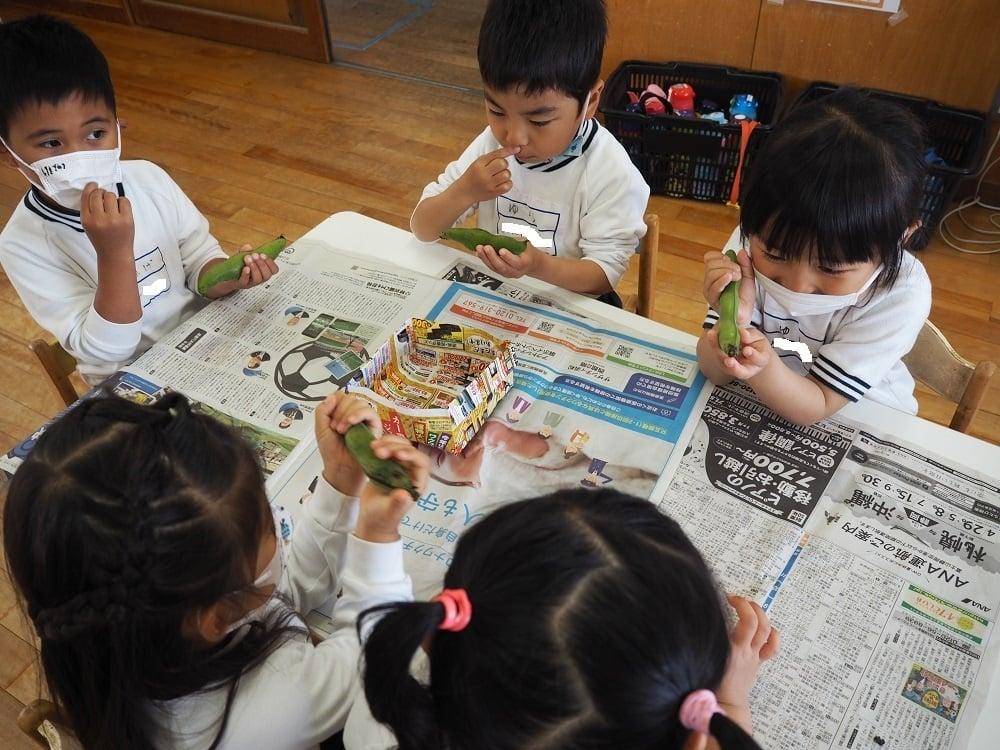 そら豆のさやむきをしました。子ども達の好きな絵本『そらまめくんのベッド』の中に出てくる言葉、「ベッドみたいにフカフカだ!」とつぶやきながら、嬉しそうにやっていた子ども達でした。