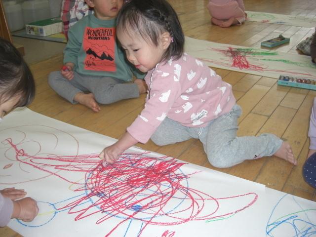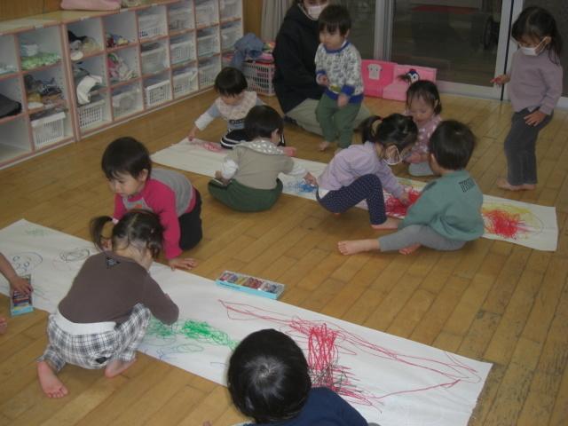 大きな紙にクレヨンで絵を描きました。アンパンマンやハートなど楽しんで描いていました。中にはダイナミックに描いたり、小さく描いたりとそれぞれ個性の出た絵ができました。