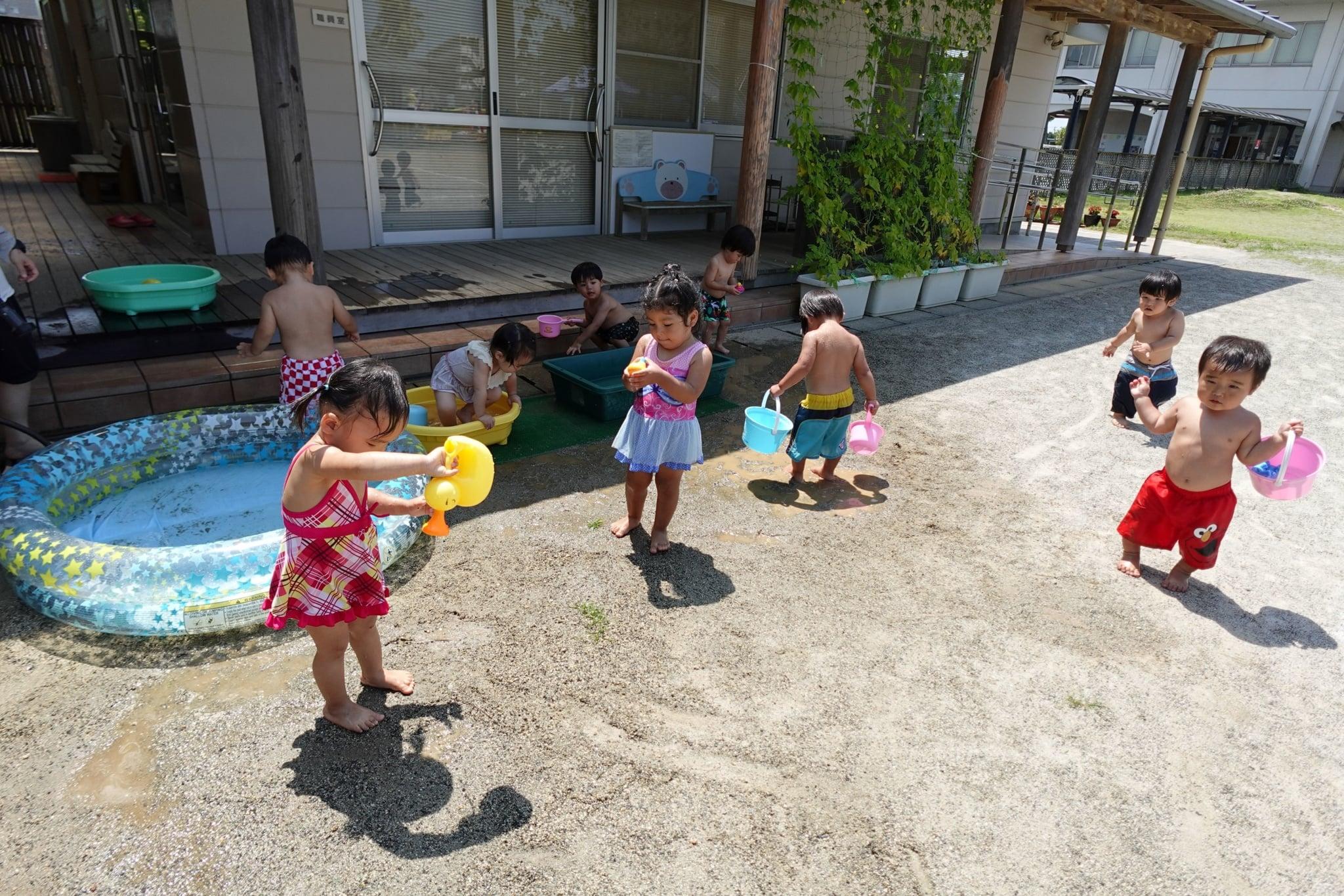6月末から始まったプール遊び!少しずつ水に慣れ、友だちと水のかけあいっこも楽しめるようになりました。