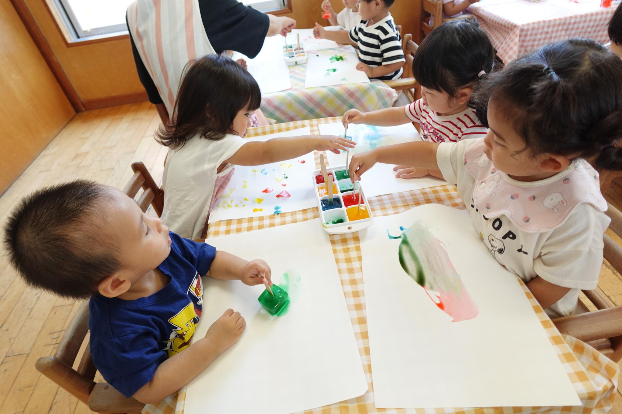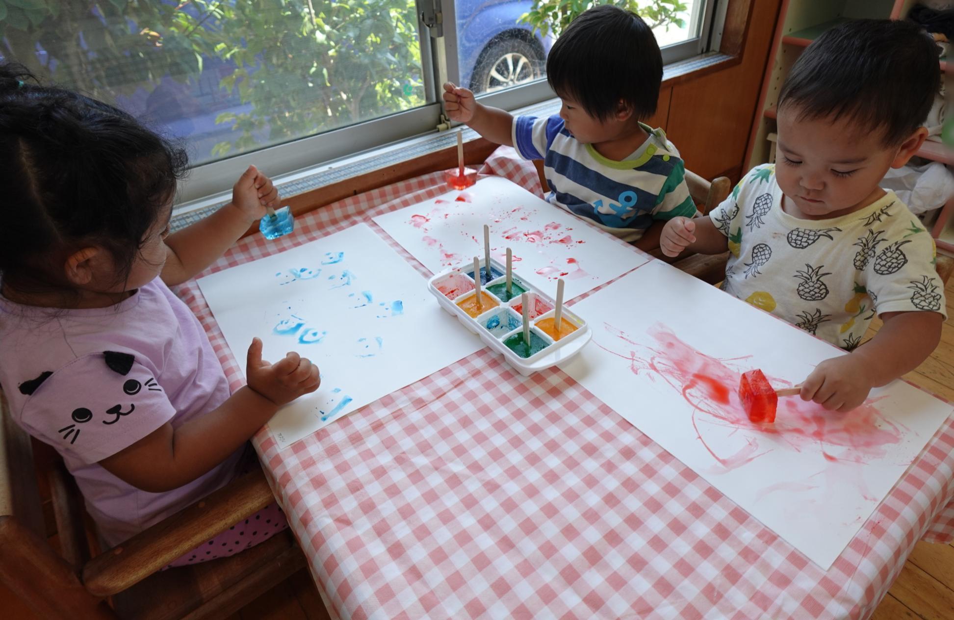 水に食紅を混ぜ凍らせた氷を使った製作をしました。好きな色の氷を選んで、画用紙にお絵描きをしました。画用紙に自由に色付けすることを楽しんでいた子どもたちです。