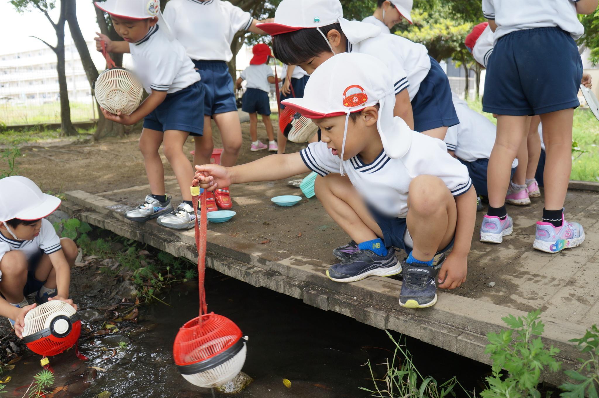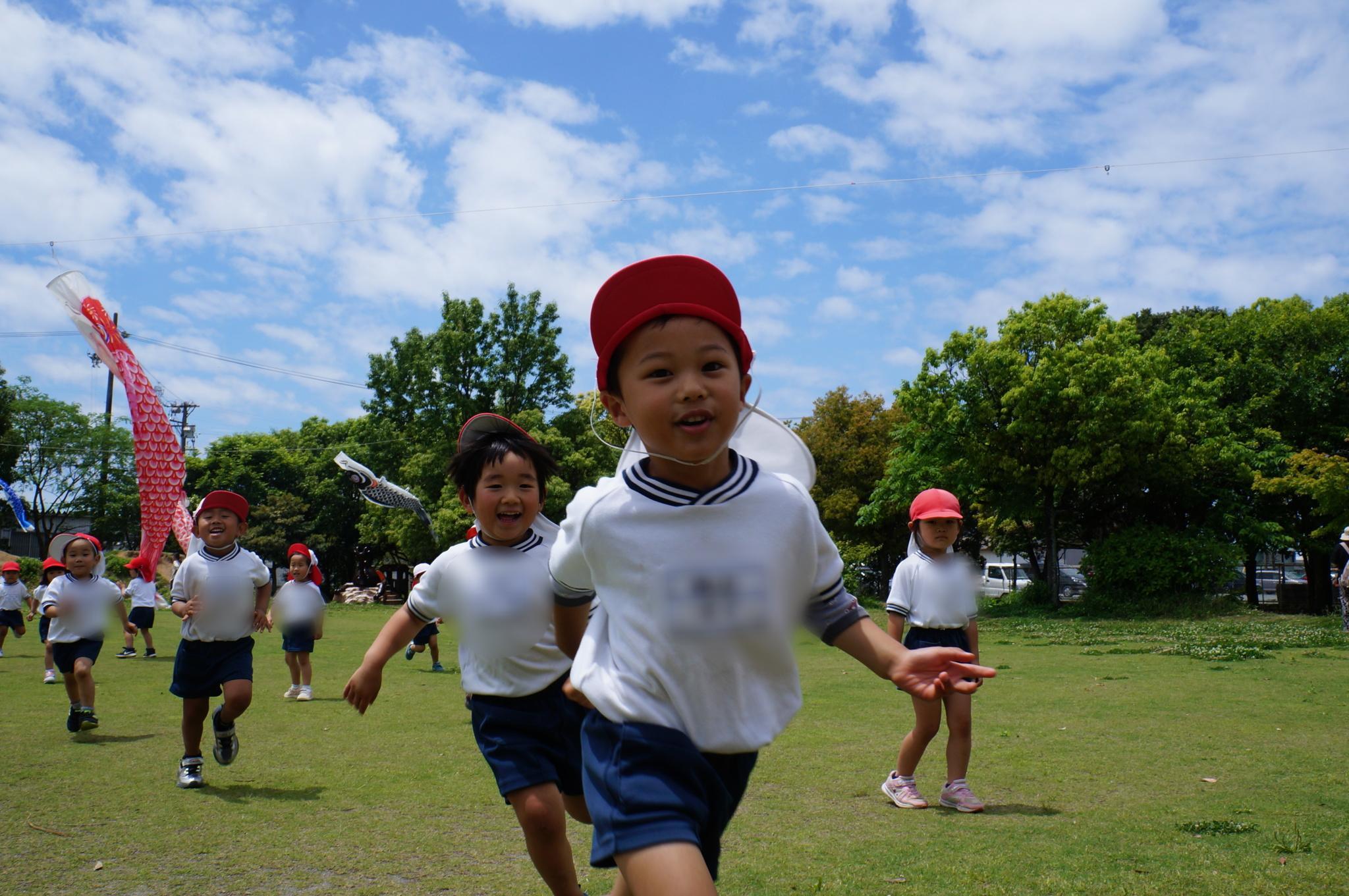 朝田幼稚園の園庭に遊びに行き、元気いっぱい遊んでいます。鬼ごっこや大型遊具、ビオトープなどで遊ぶことを楽しんでいます。