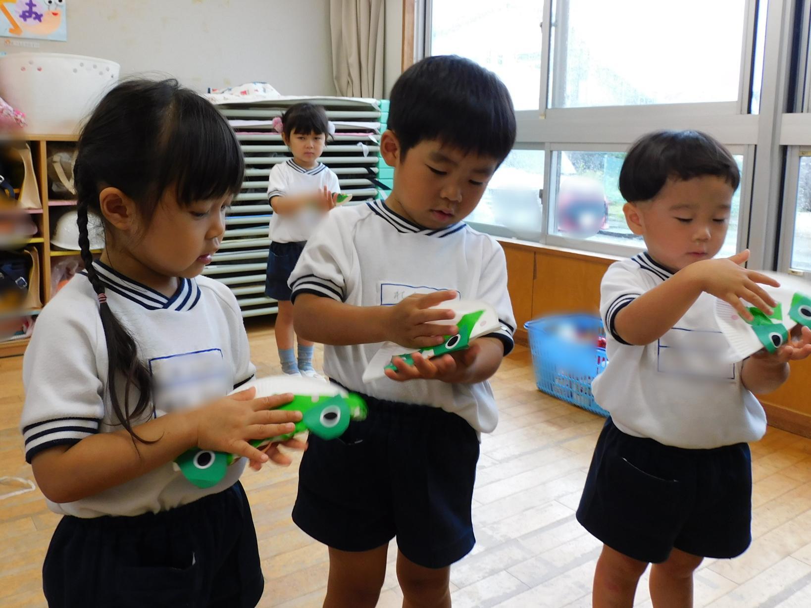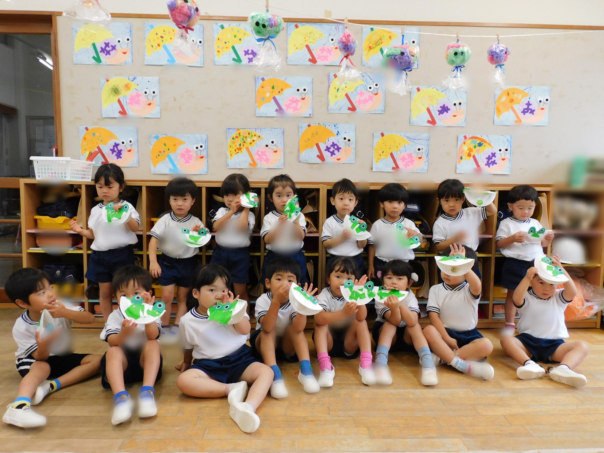 雨の日、かえるのカスタネット作りをしました。紙皿に折り紙をちぎって貼り、目とほっぺたのシールを貼って完成。かえるの歌などのピアノに合わせて叩き、音を鳴らして楽しみました♪お絵描きやのりづけがも上手になり、いろいろな製作も楽しんでいます。