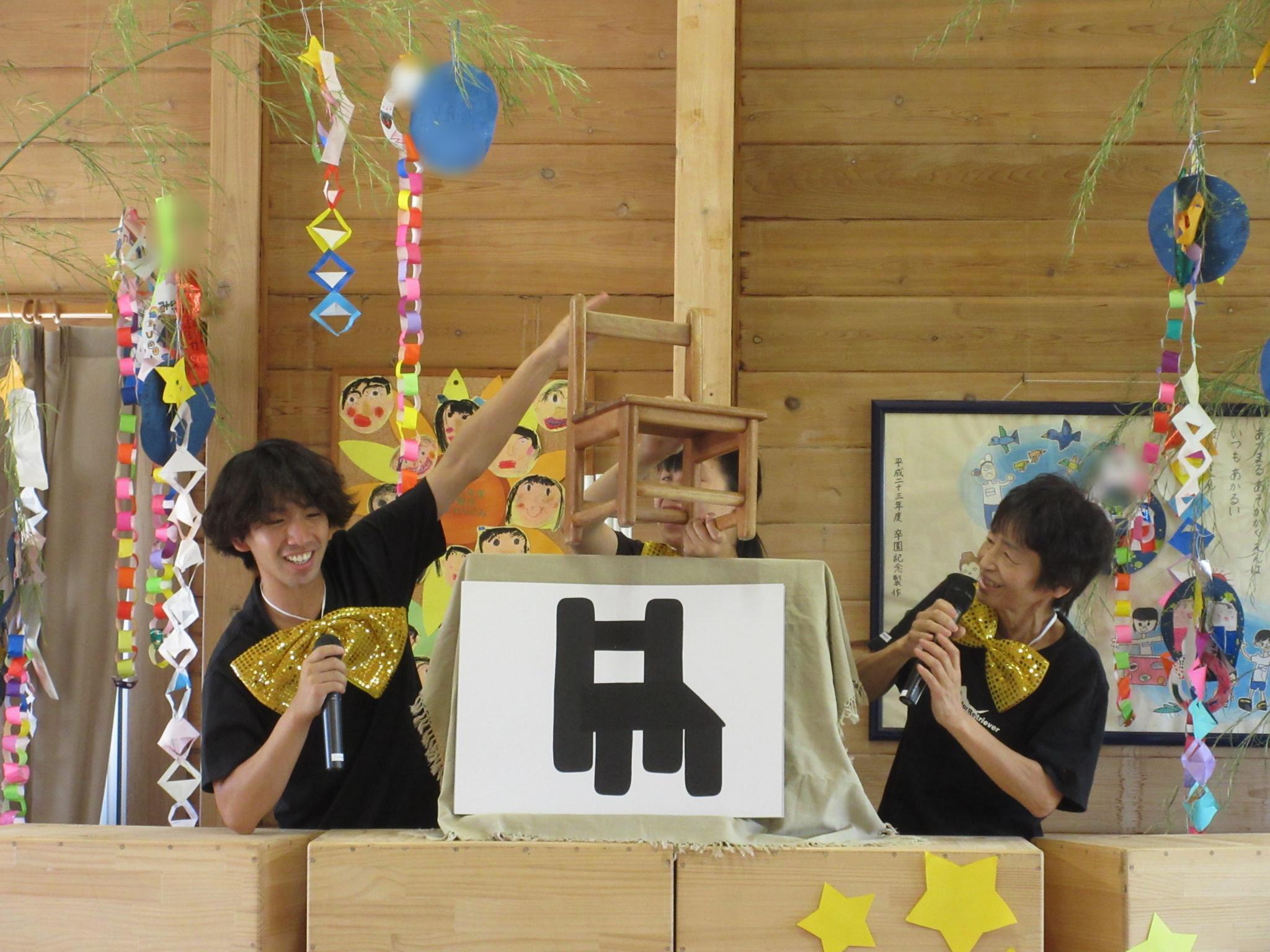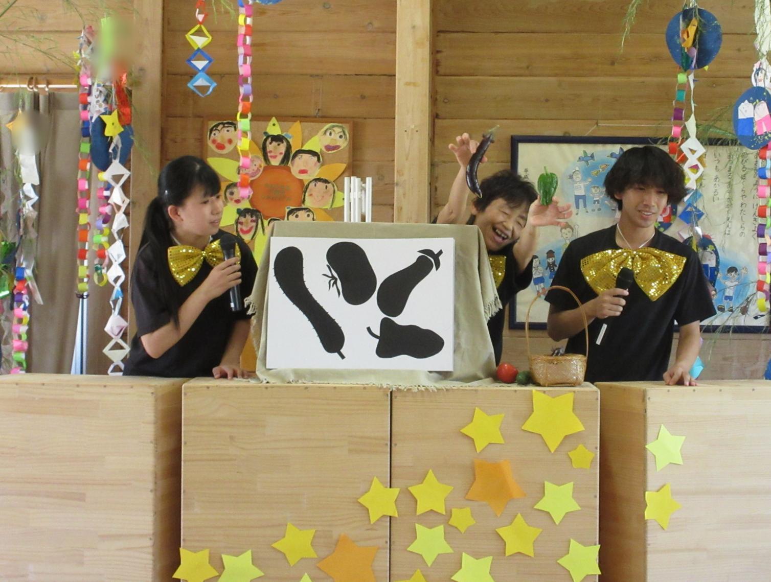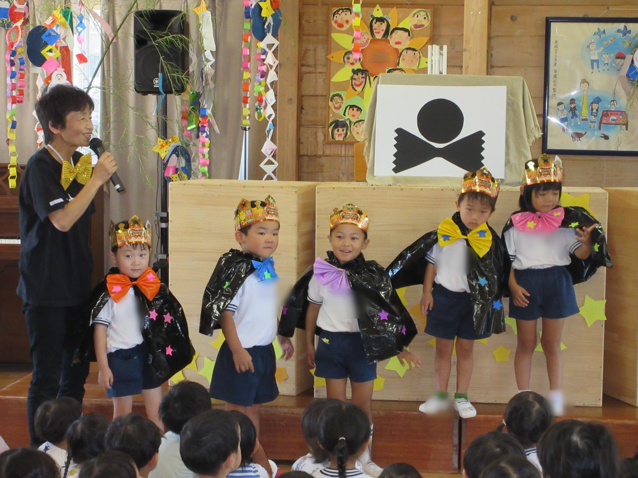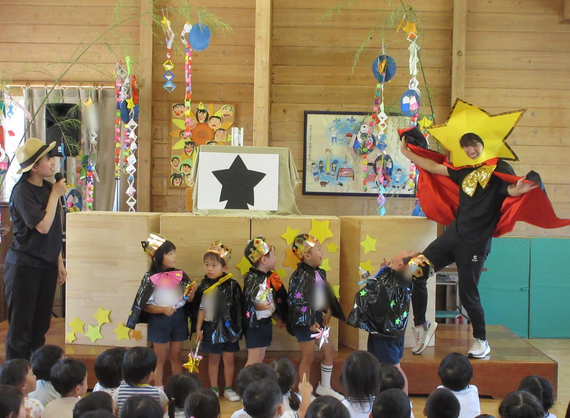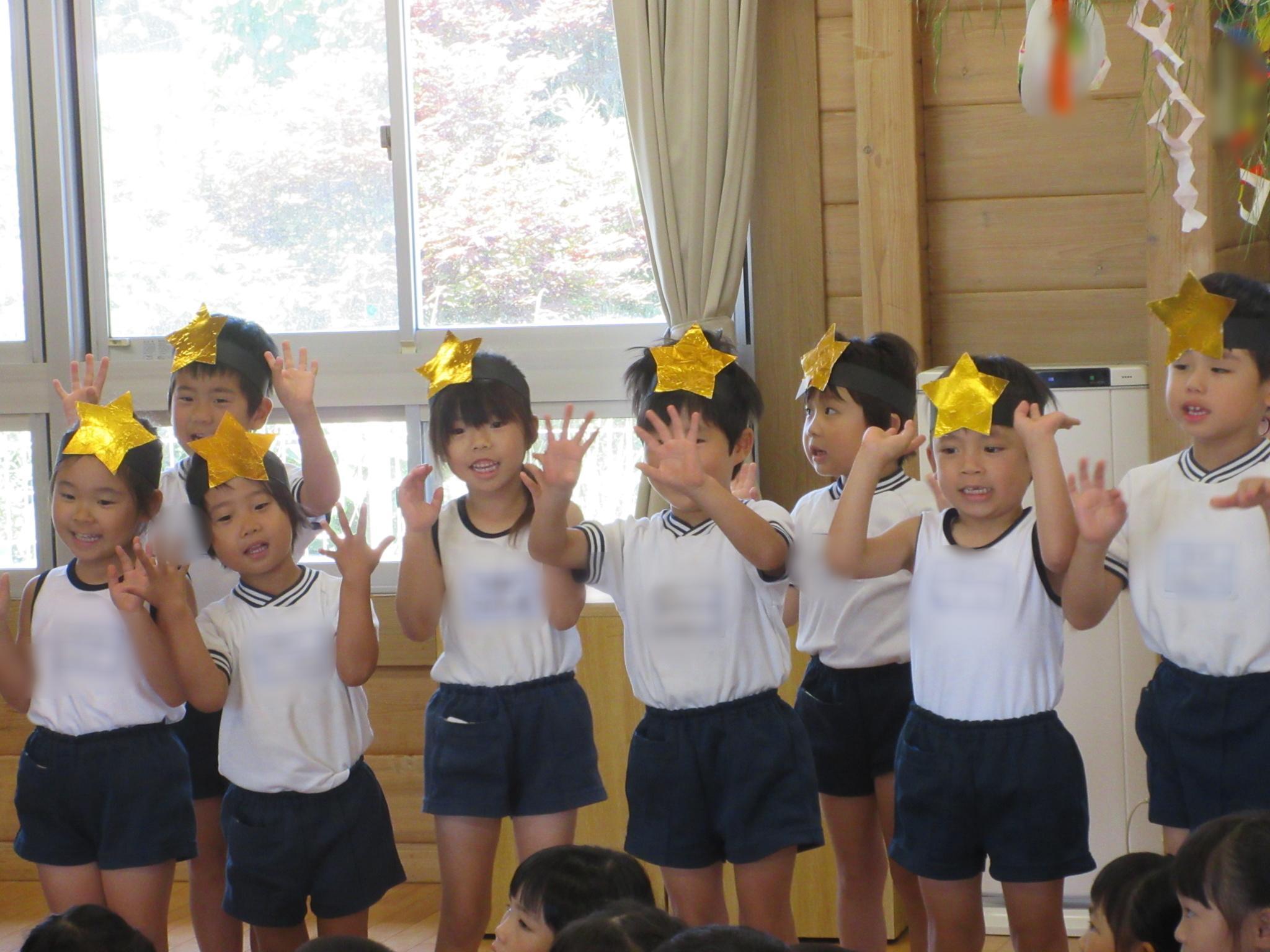 七夕のお話のペープサートを見て、先生たちの出し物は「シルエットクイズ」!たくさんのシルエットが出てきて、子どもたちも元気に答えてくれました。難しい問題もたくさんありましたが、楽しくクイズに挑戦!その中で、誕生児のお友だちが問題に登場したり、先生が変身して出てきたり・・・大盛り上がりでした!最後はみんなで「きらきら星」を歌いました。ひまわりさんが手話も披露してくれ、楽しい会になりました。