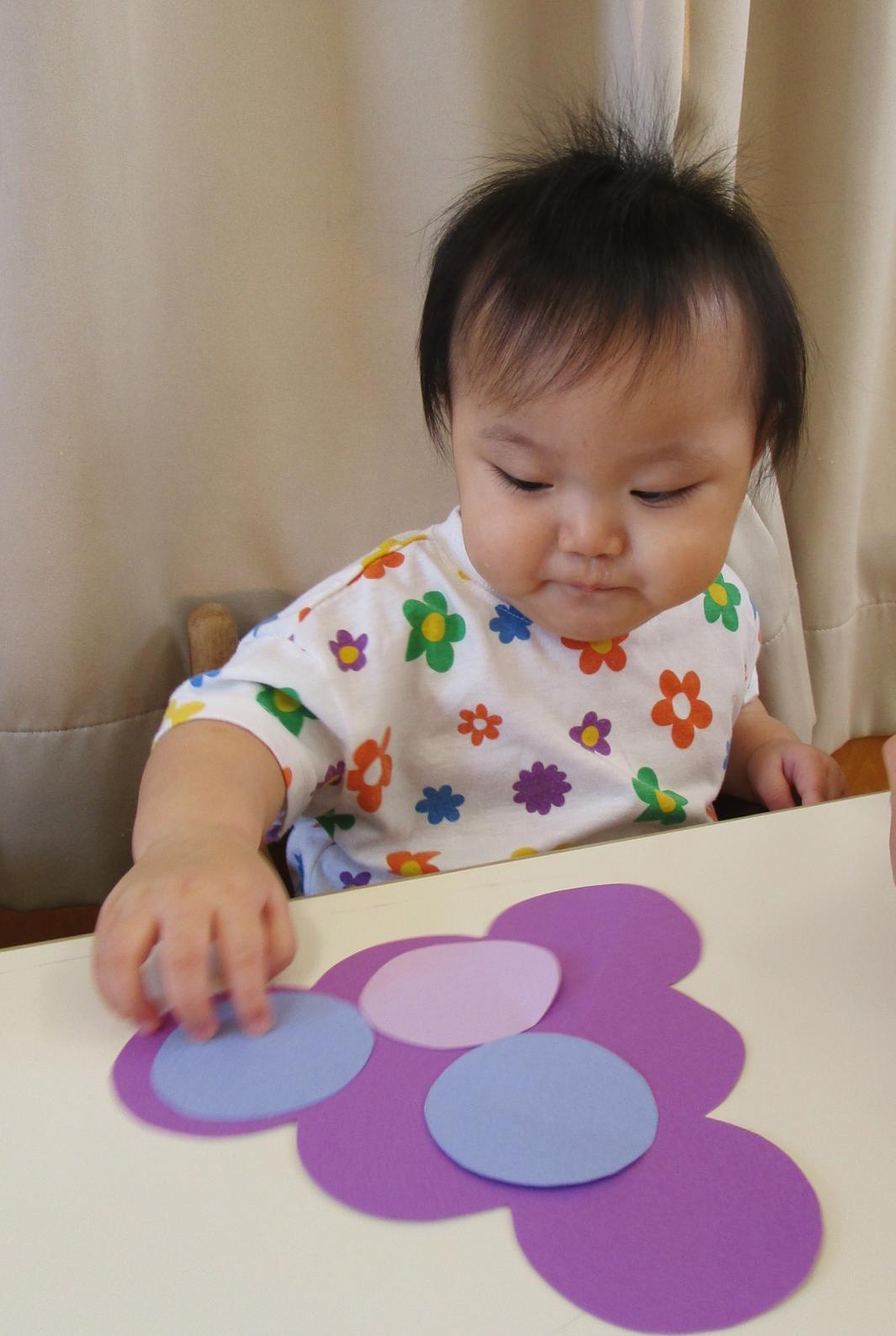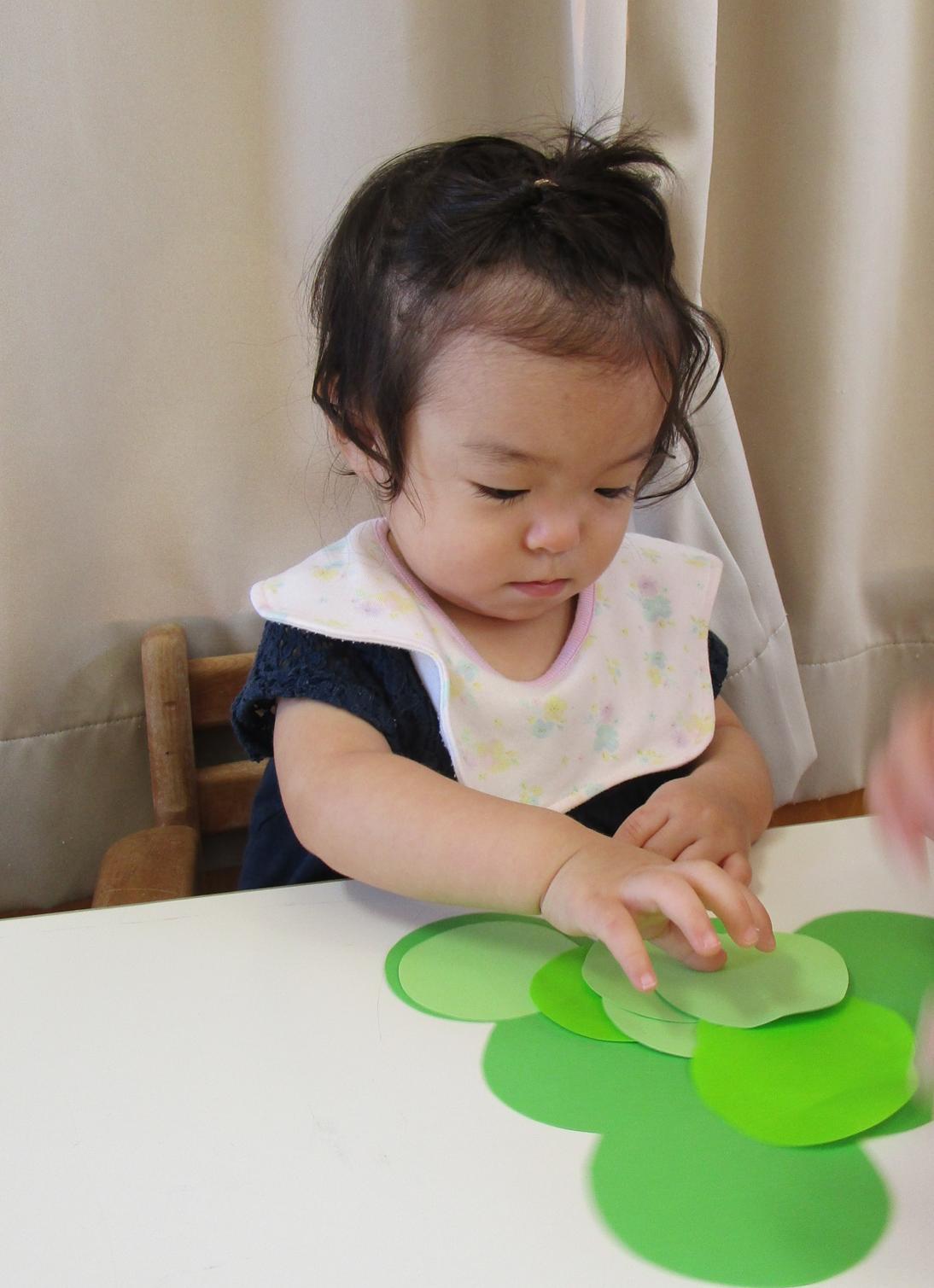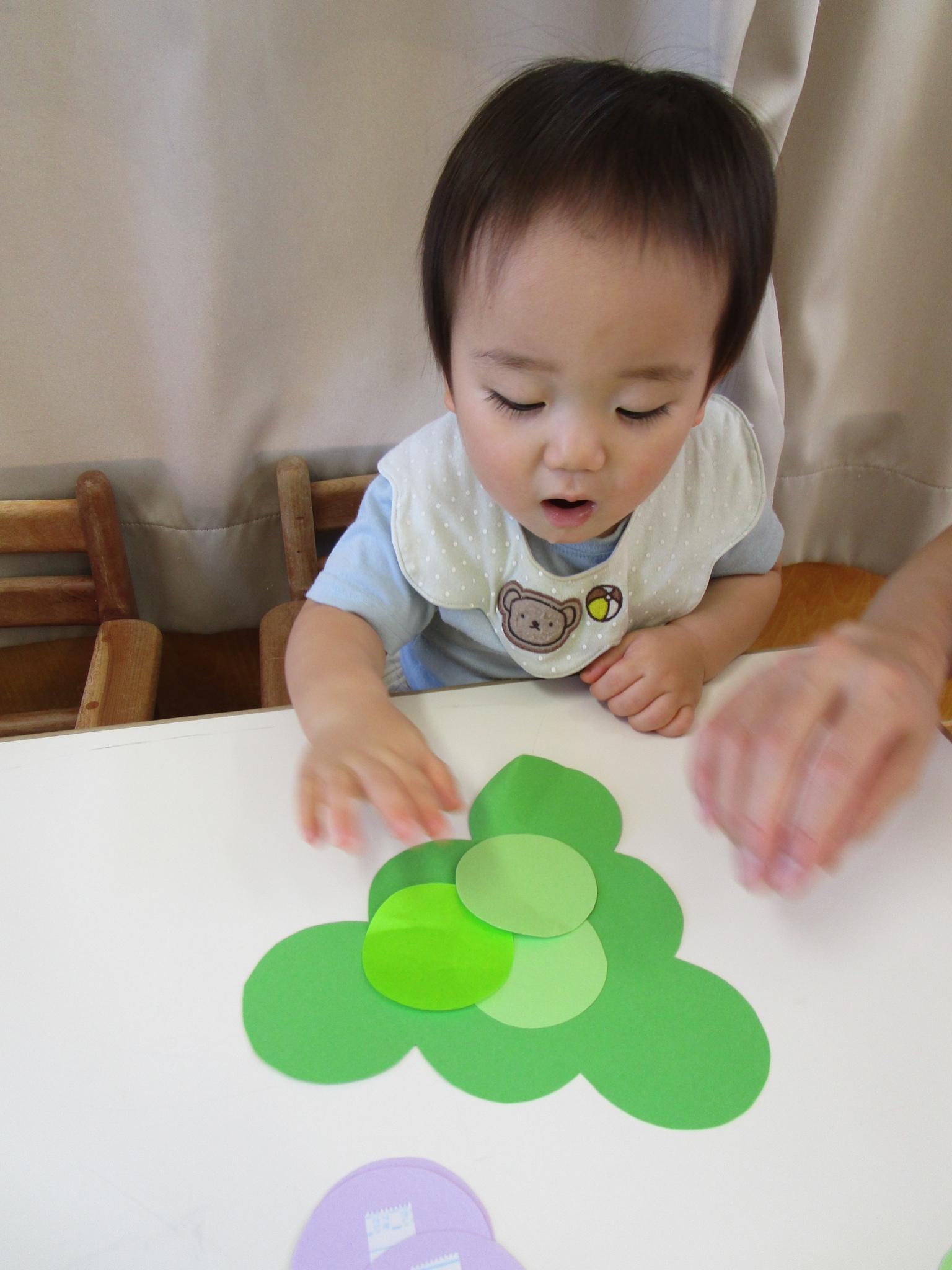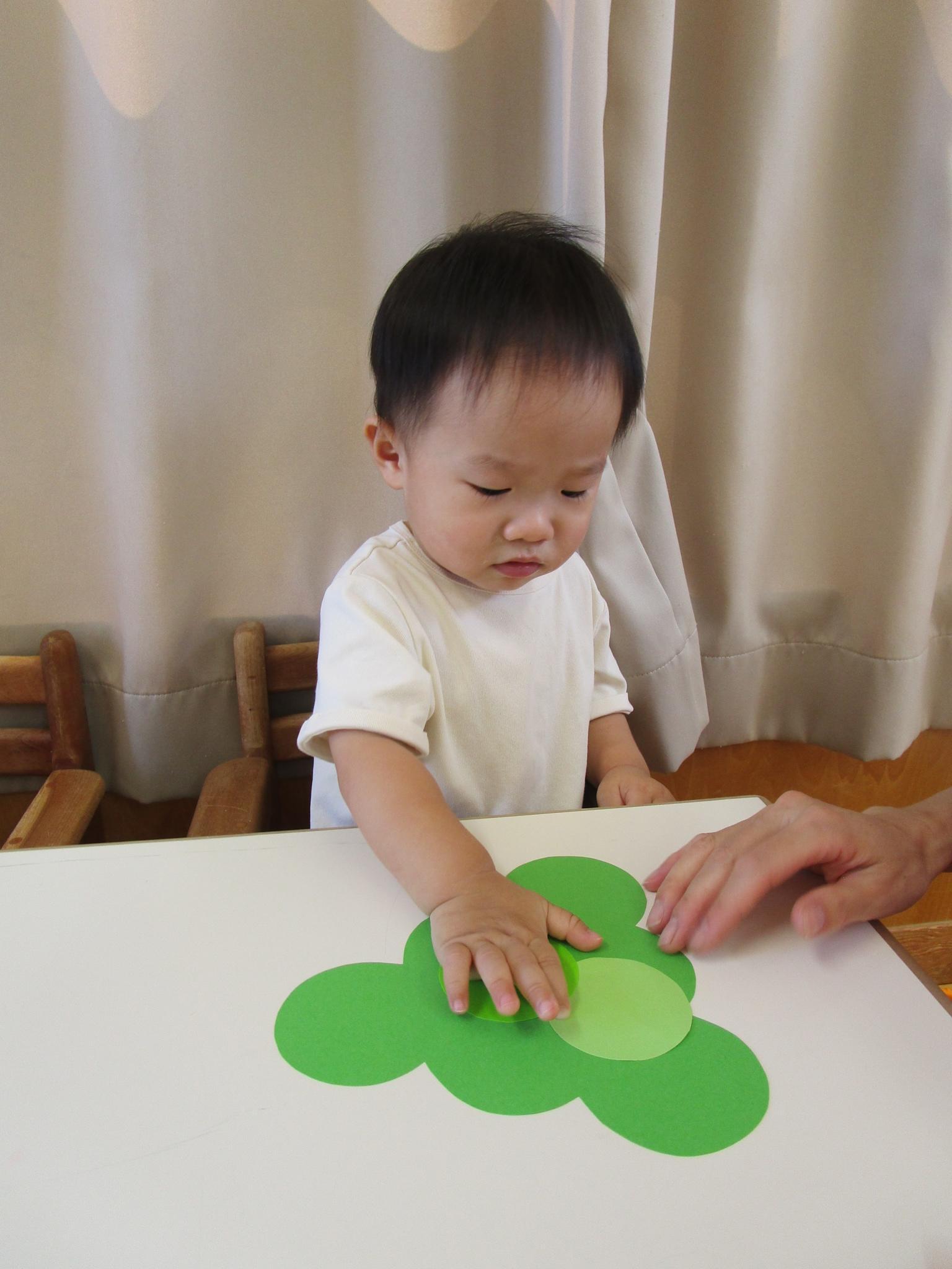 ぶどうの製作をしました。先生と一緒に丸の画用紙をひとつずつ貼ることができました。上手にできたね!