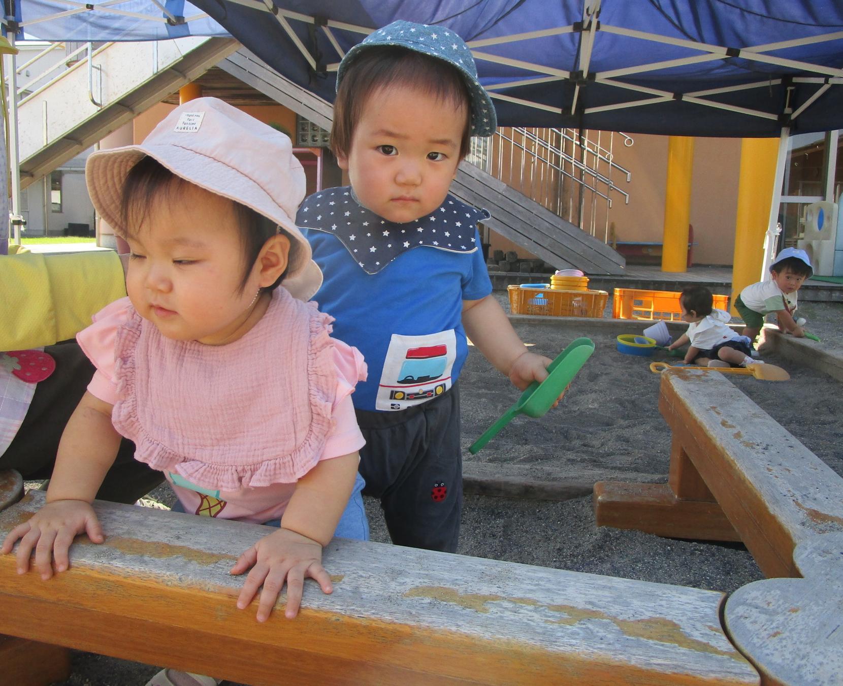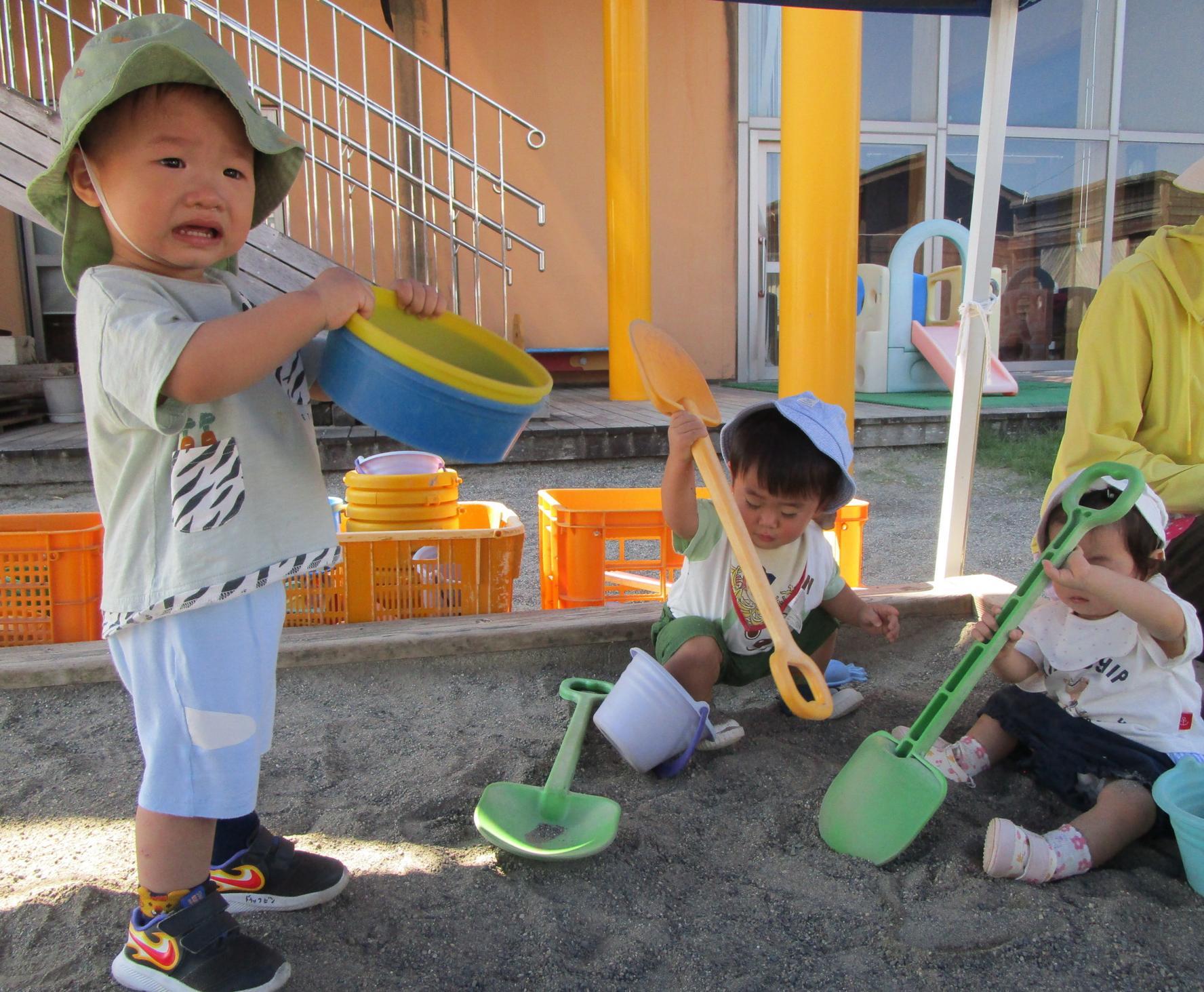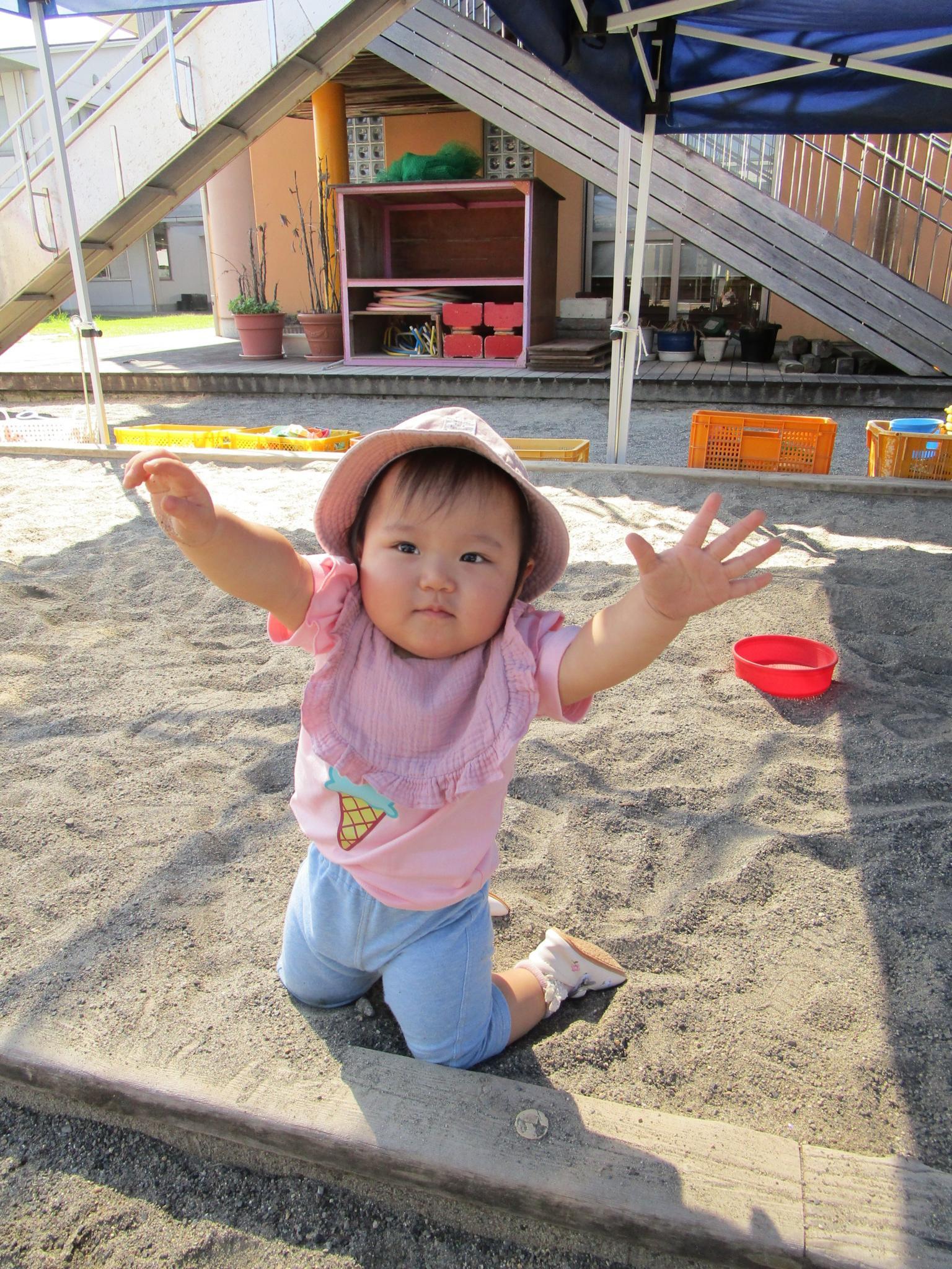 お砂場遊び大好きつくしさん!砂をバケツに入れてみたり、おもちゃを出してみたり、おもちゃを触ってみたり・・・。