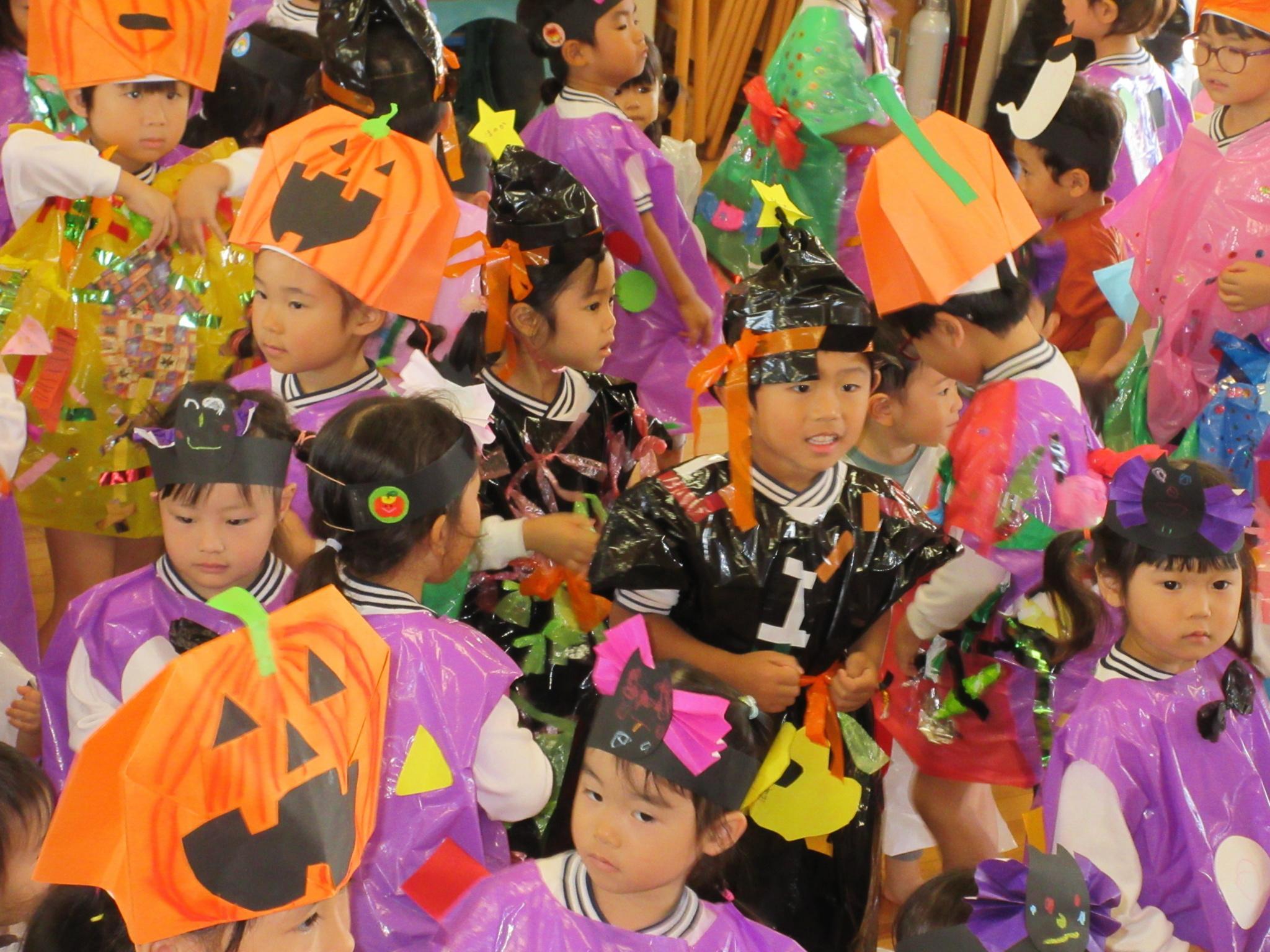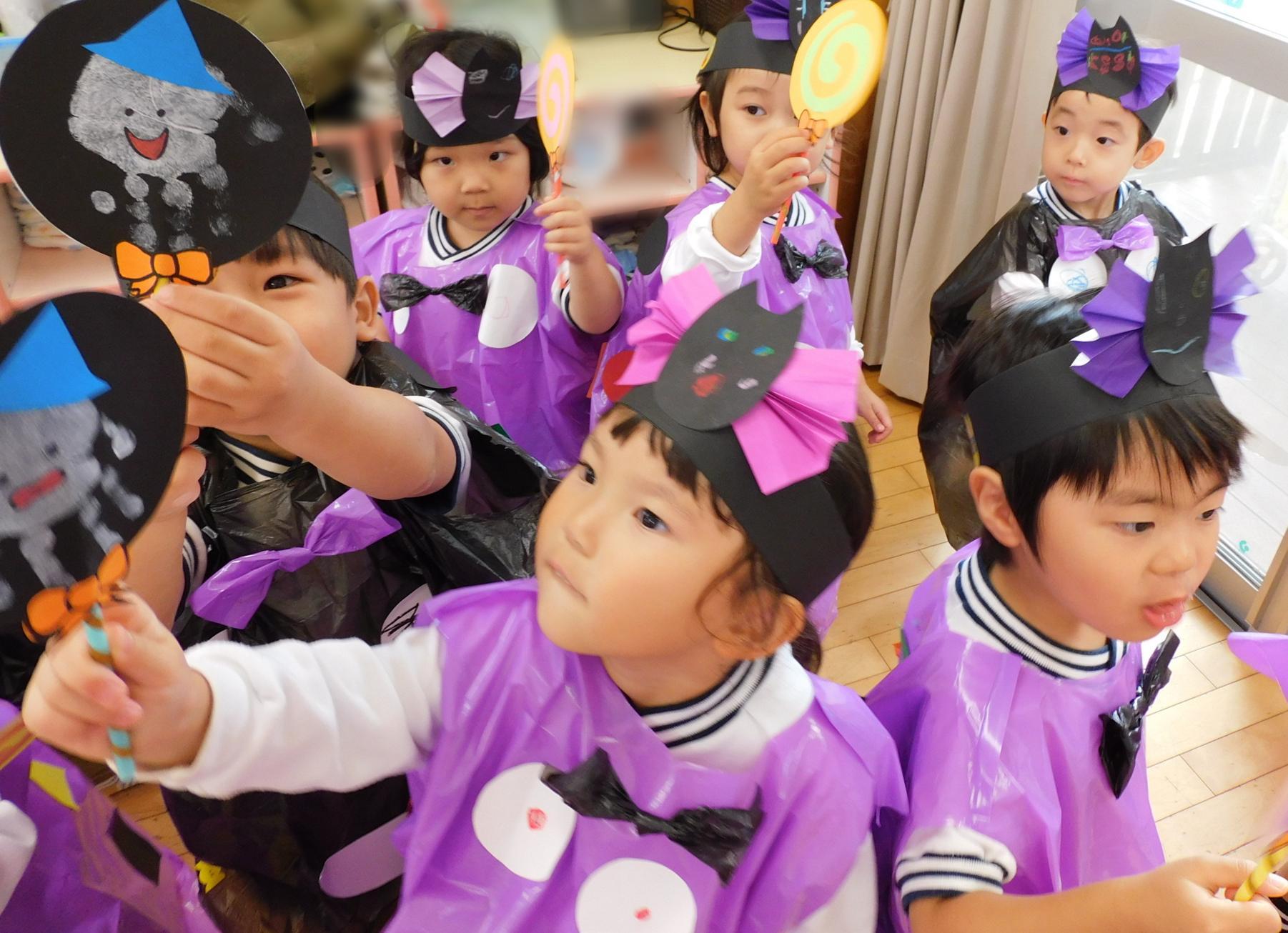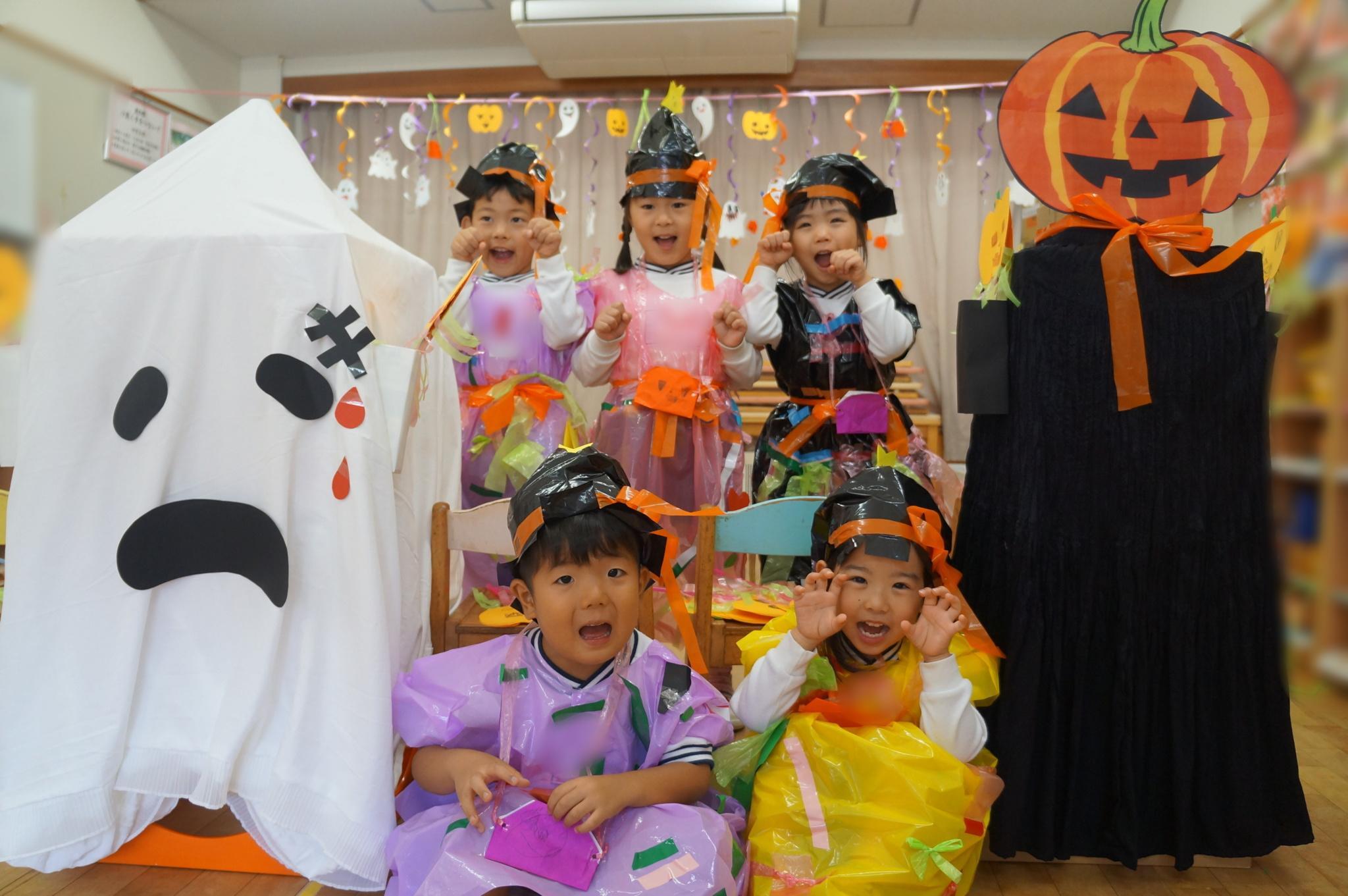 先日、ハロウィンパーティーをしました。手作り衣装やアイテムを身につけ、かわいく変身!お部屋も飾り付け!「トリックオアトリート!」と各クラスをまわったり、戸外をパレードしたり、みんなでダンスしたり・・・楽しく過ごすことができました☆異年齢交流でお給食も一緒に食べました!