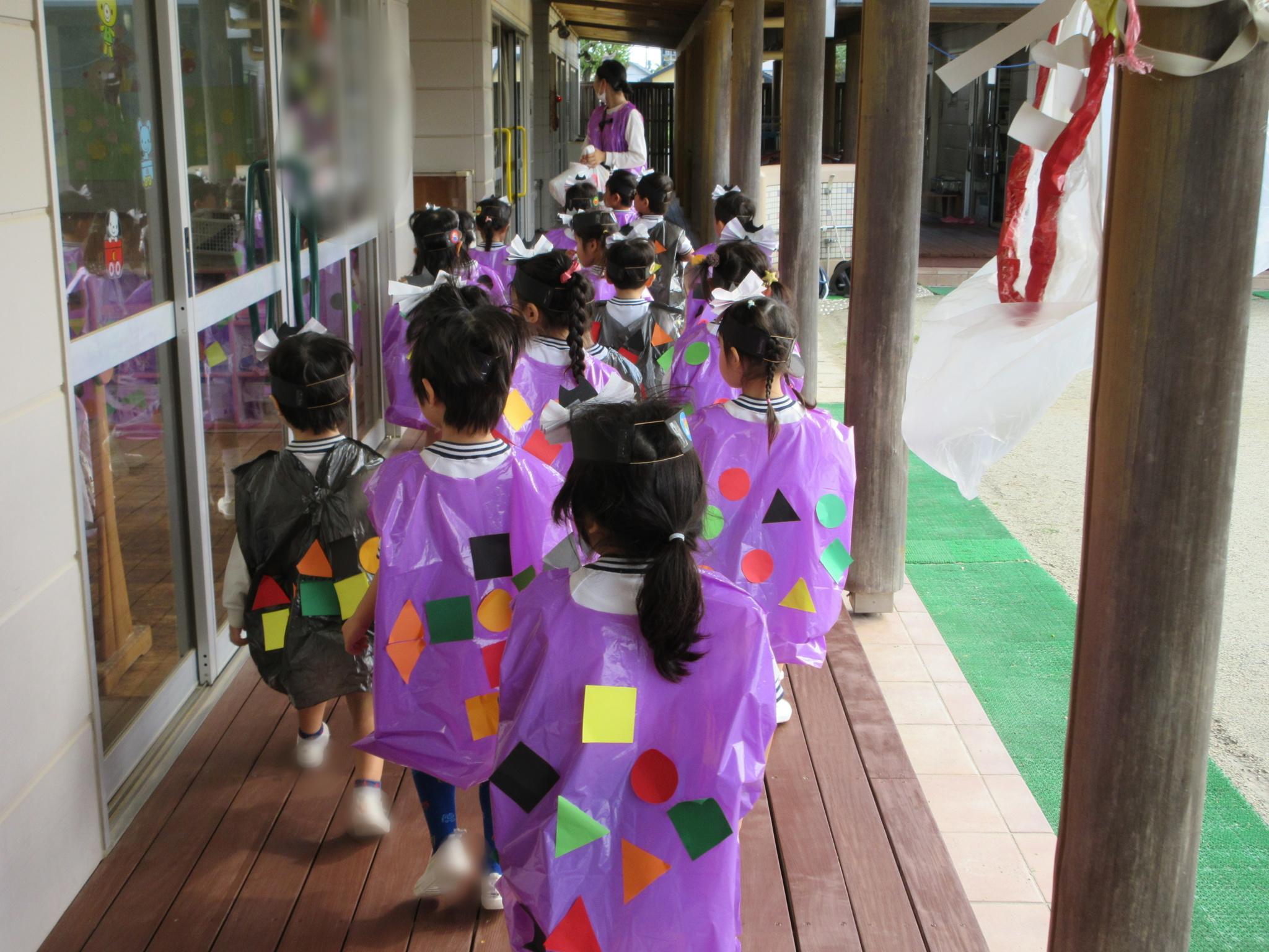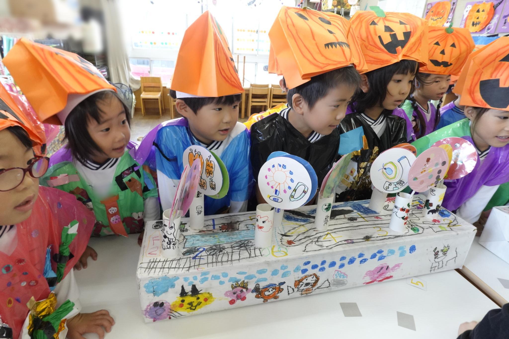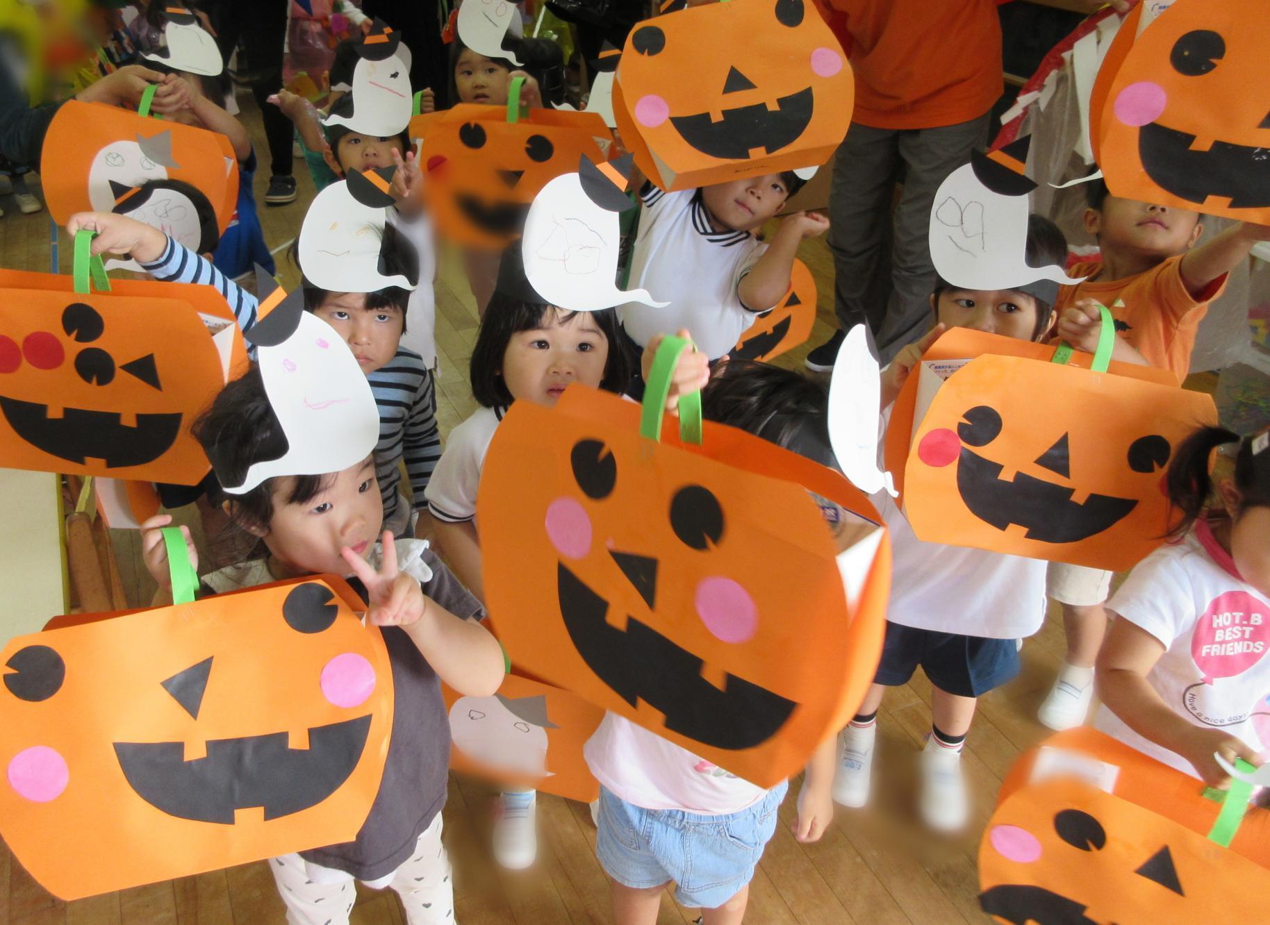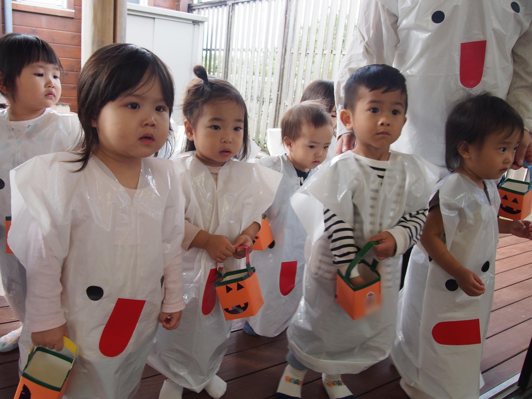 先日、ハロウィンパーティーをしました。手作り衣装やアイテムを身につけ、かわいく変身!お部屋も飾り付け!「トリックオアトリート!」と各クラスをまわったり、戸外をパレードしたり、みんなでダンスしたり・・・楽しく過ごすことができました☆異年齢交流でお給食も一緒に食べました!