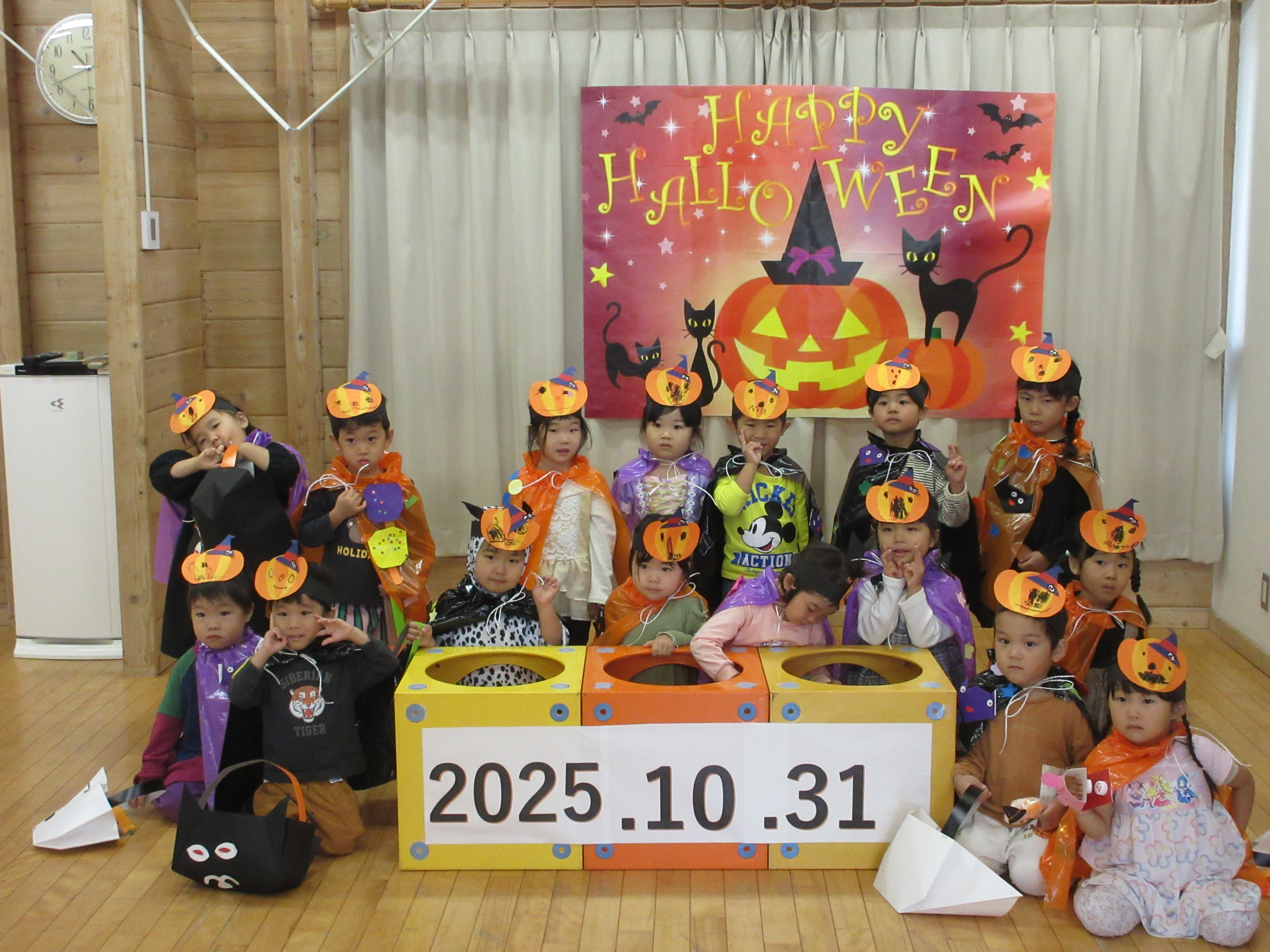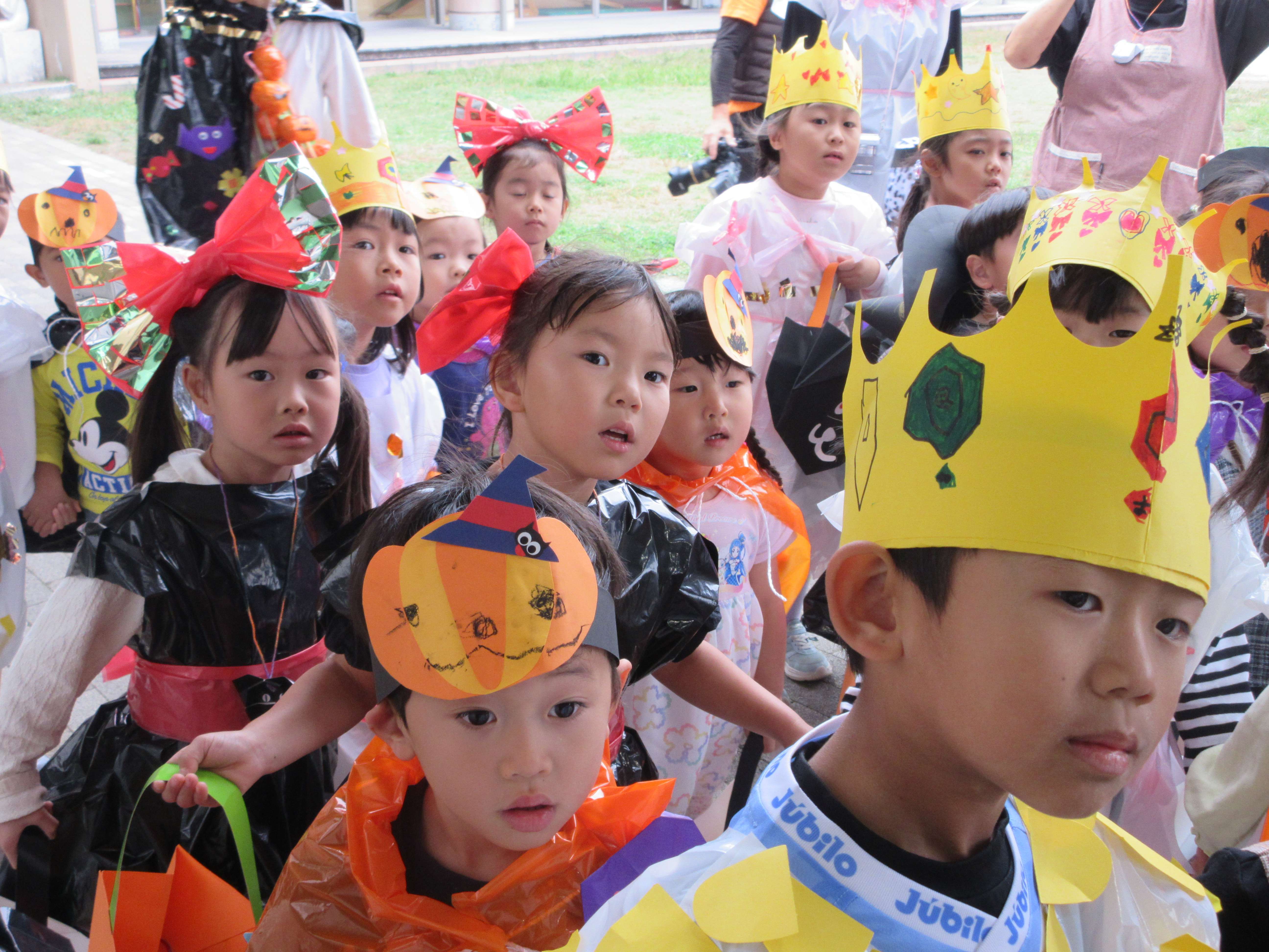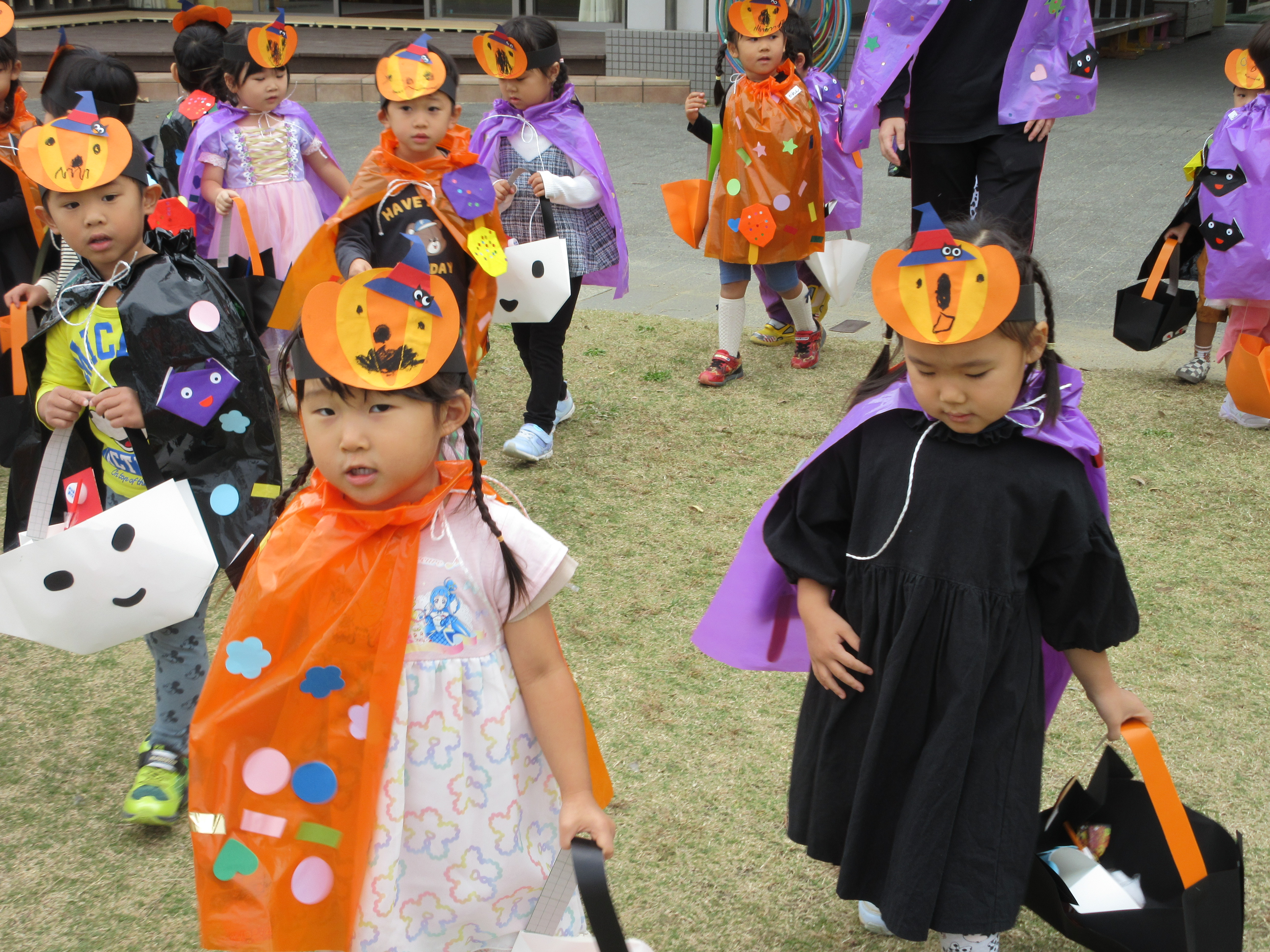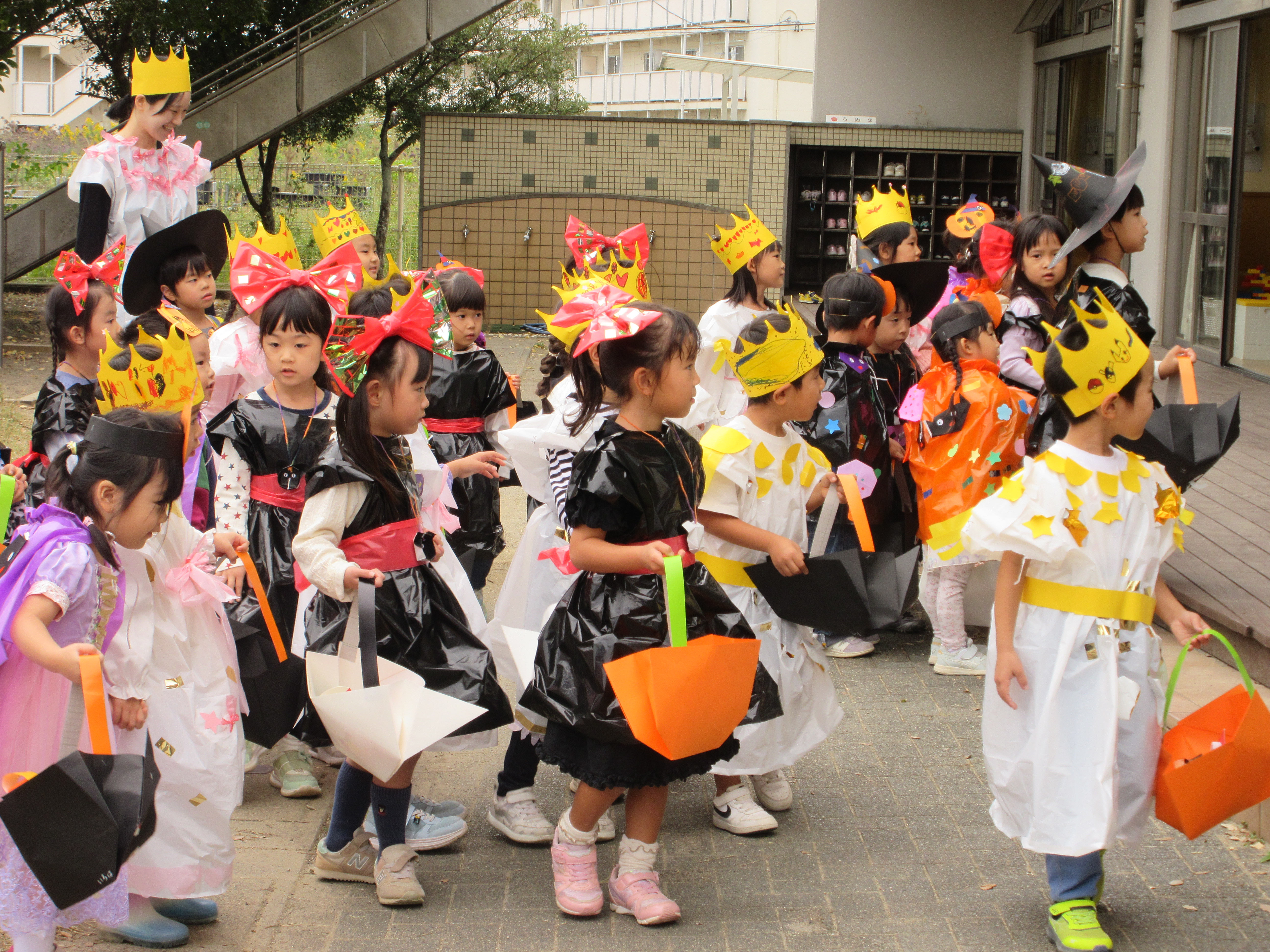 楽しみにしていたハロウィンパーティー!各クラス手作りの衣装を準備し、当日はどの子もとてもかわいく仮装しました。「トリックオアトリート!」と大きな声で各クラスをまわり、プレゼントの交換をしたり、ゲーム遊び、幼稚園までパレードもしてみんなで交流を楽しみました。